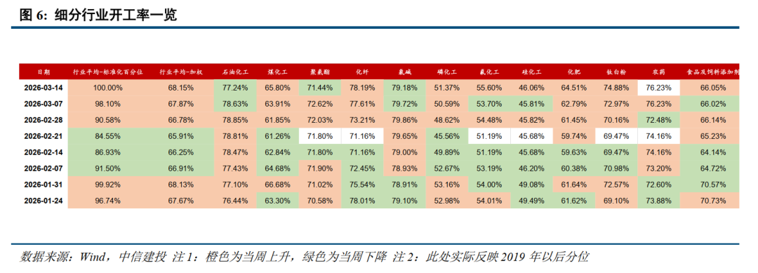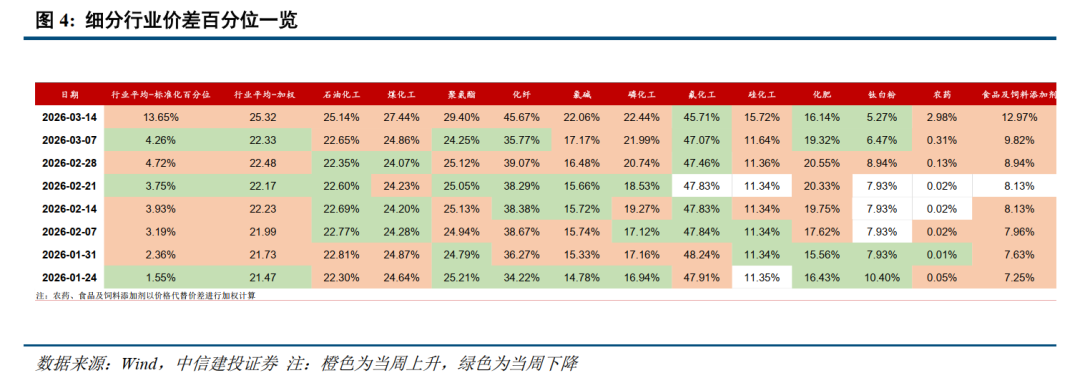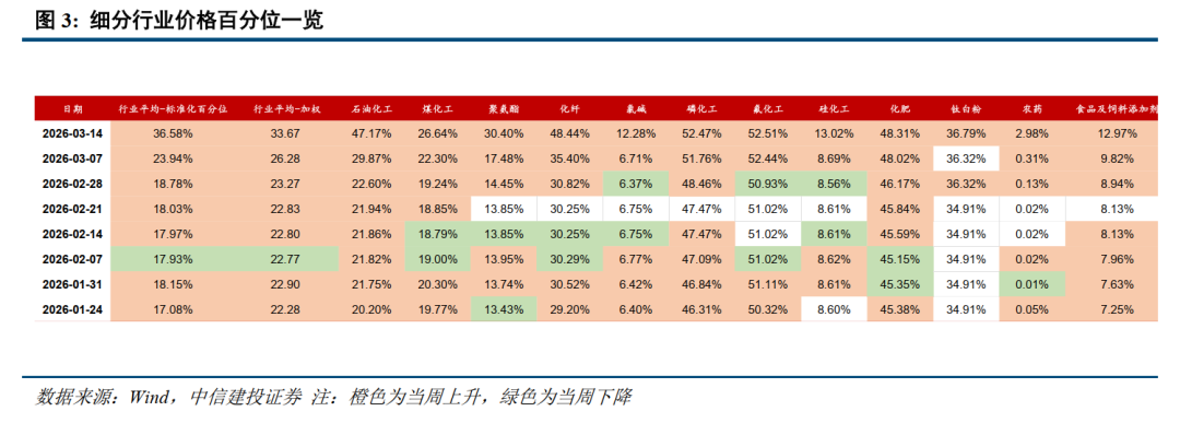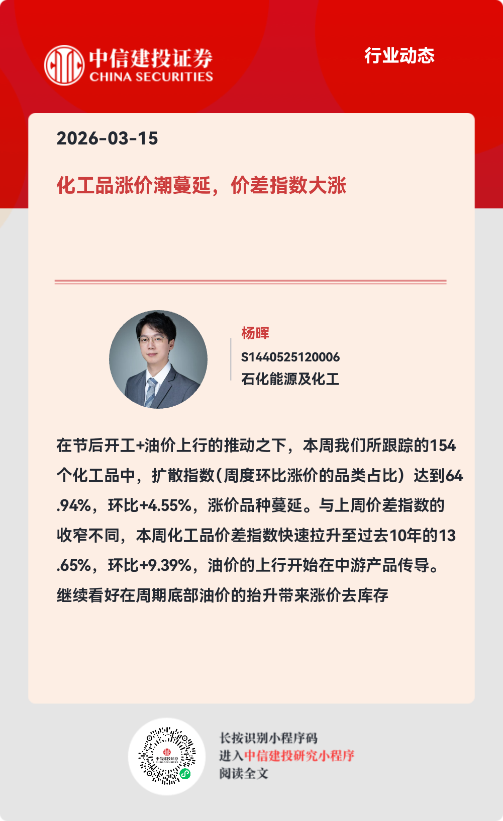 在节后开工+油价上行的推动之下,本周我们所跟踪的154个化工品中,扩散指数(周度环比涨价的品类占比)达到64.94%,环比+4.55%,涨价品种蔓延。与上周价差指数的收窄不同,本周化工品价差指数快速拉升至过去10年的13.65%,环比+9.39%,油价的上行开始在中游产品传导。继续看好在周期底部油价的抬升带来涨价去库存,新的一轮库存周期有望启动。