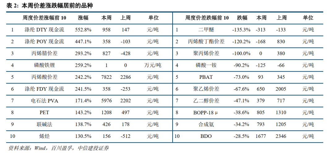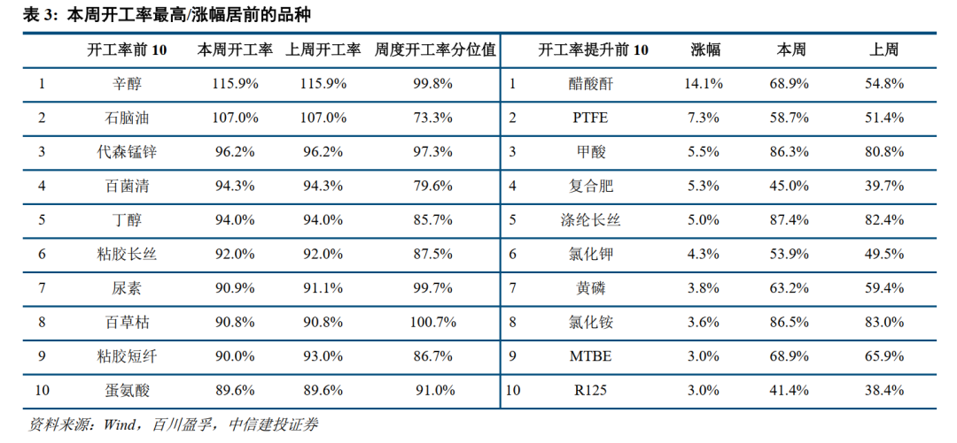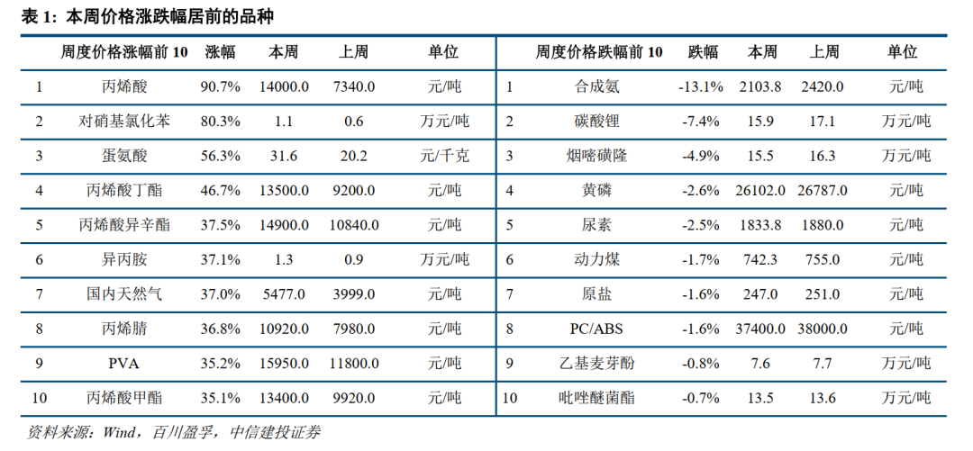 本周中信建投化工行业指数103.80,环比+28.11%,同比+23.77%;行业价格百分位为过去10年的36.58%,环比+12.65%;行业价差百分位为过去10年的13.65%,环比+9.39%;行业库存百分位为过去5年的77.88%,环比-9.12%;行业开工率为68.15%,环比+0.28%。本周价格涨幅居前的品种有:丙烯酸(+90.7%)、对硝基氯化苯(+80.3%)、蛋氨酸(+56.3%)、丙烯酸丁酯(+46.7%)、丙烯酸异辛酯(+37.5%);本周价格跌幅居前的品种有:合成氨(-13.1%)、碳酸锂(-7.4%)、烟嘧磺隆(-4.9%)、黄磷(-2.6%)、尿素(-2.5%)。本周开工率最高的五大品种:辛醇(115.9%)、石脑油(107.0%)、代森锰锌(96.2%)、百菌清(94.3%)、丁醇(94.0%);本周开工率提升居前的品种有:醋酸酐(14.1%)、PTFE(7.3%)、甲酸(5.5%)、复合肥(5.3%)、涤纶长丝(5.0%)。